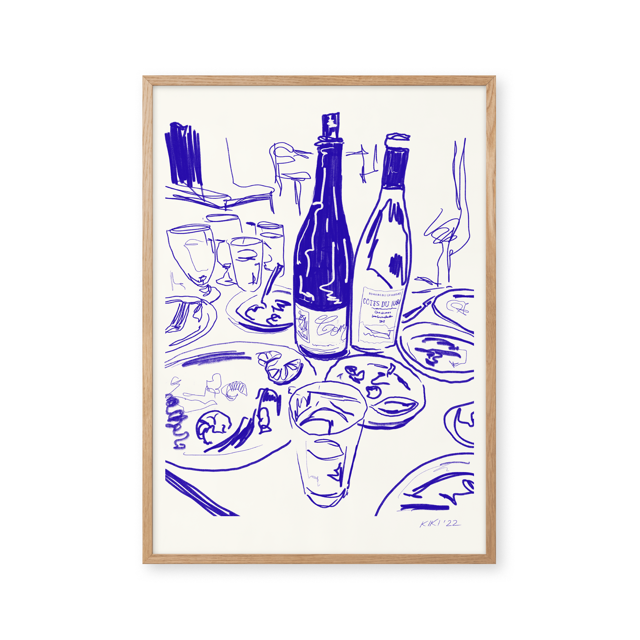 The art poster "Petit alep" by the artist Kiki Makes is an illustrated poster curated for Peléton. The work is inspired by a meal at Petit Alep, a hidden gem serving small dishes and natural wine. The drawing shows a bottle from Jura, Burgundy, and a plate with shrimp. This work was created digitally using minimalist colors and lines.