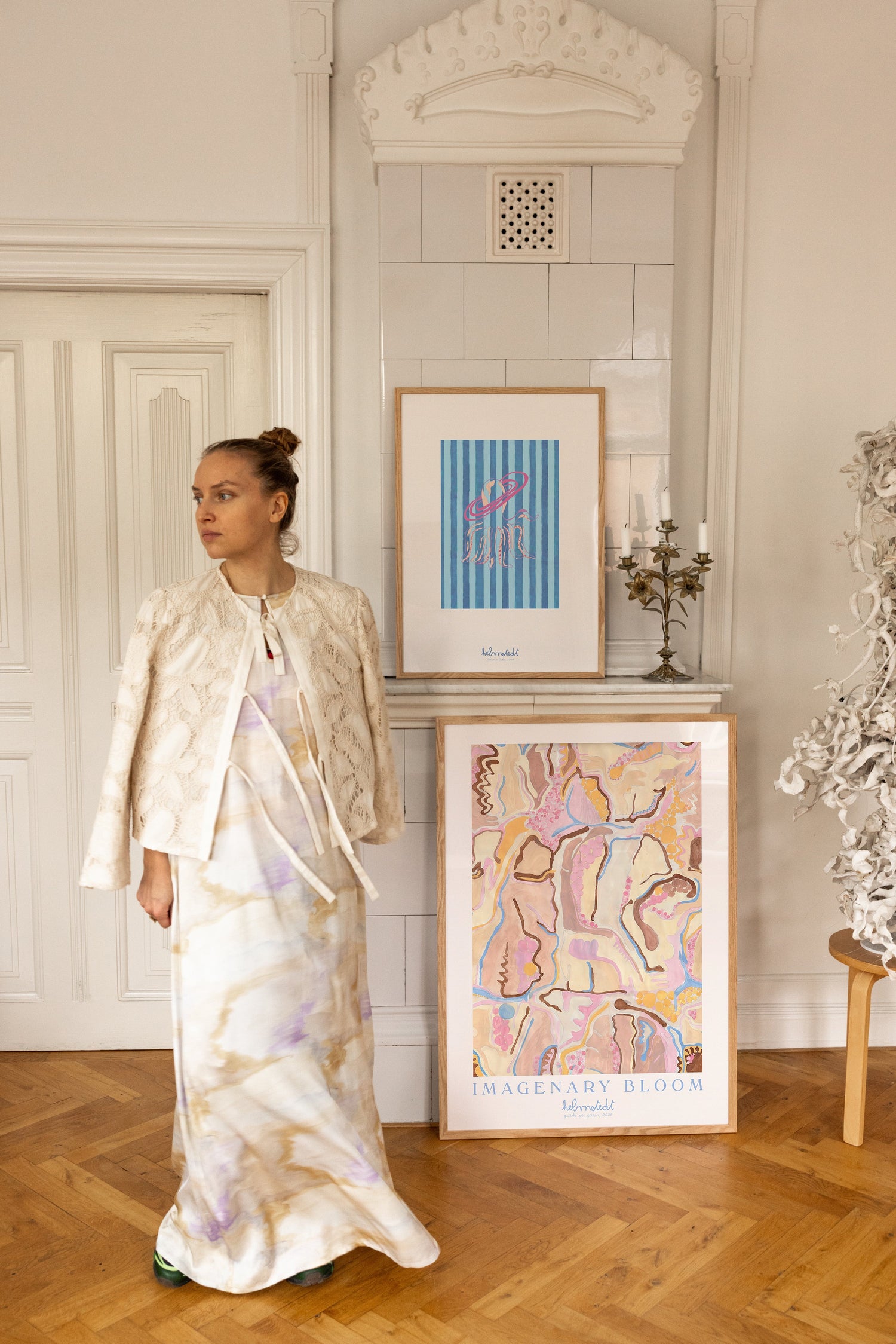 Emilie Helmstedt er kunstneren bag de 9 værker. Hendes signaturstil og personlighed er tydeligt til stede i hver eneste plakat. Kunsten er et levende udtryk for hendes indre verden – drømmende, farverig og fuld af liv. Hver gang Emilie begiver sig ud i at skabe en ny tøjkollektion, starter processen med et maleri i akvarel, der bliver omdannet til et kunstværk, som til sidst finder sin vej til tøjet. En smuk rejse, hvor hendes originale kunstværker bliver en del af fashion-verdenen.