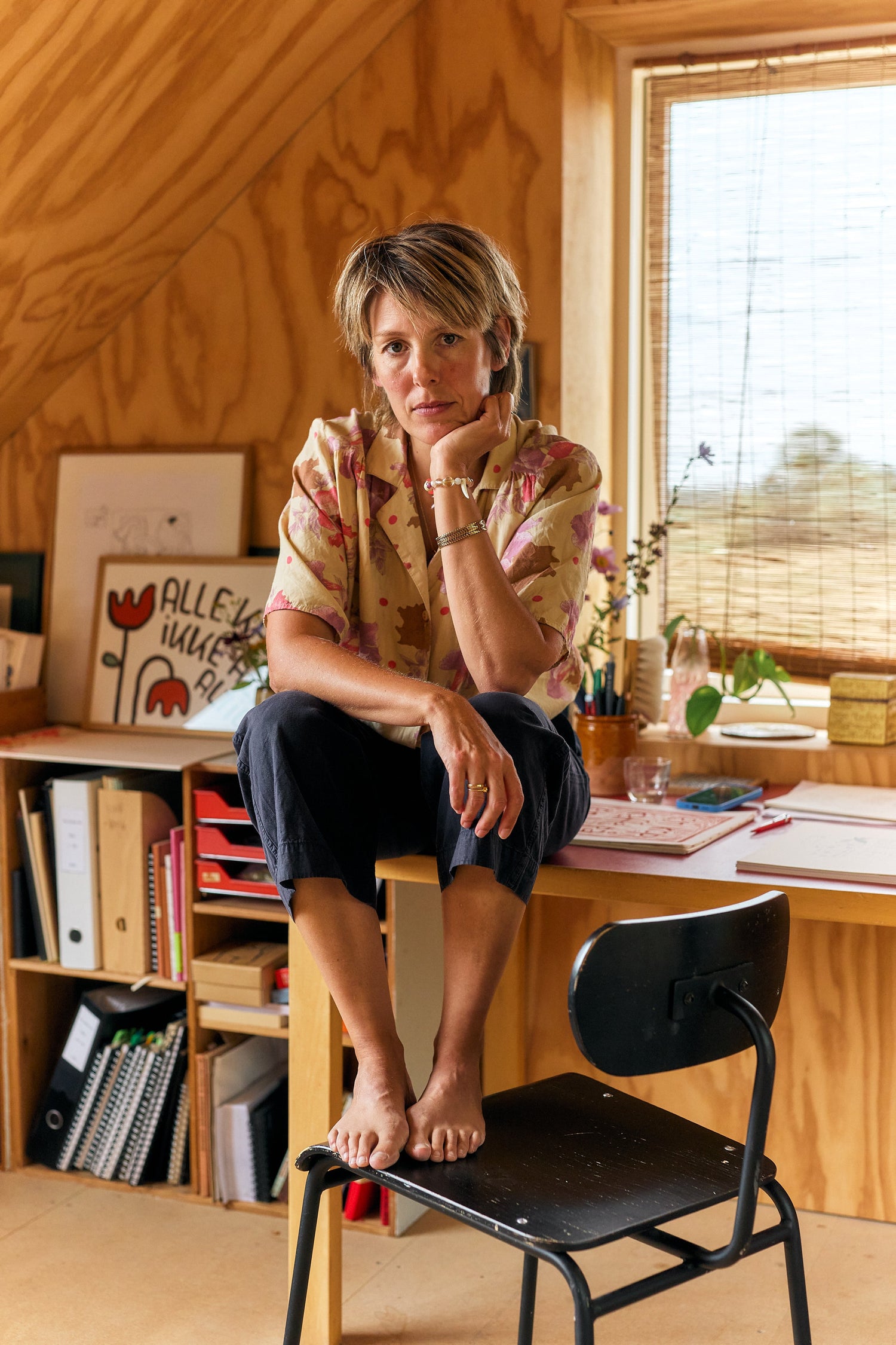 Hendes kunstplakater bringer hverdagens sårbarhed og humor ind i hjemmet. med enkle streger skildrer hun kaos, kaffen på bordet og øjeblikke, hvor det hele drøner. farver og form er afdæmpede, men stemningsfulde – kunst og æstetik møder rå følelser.