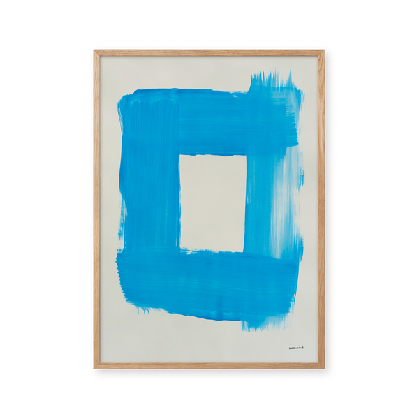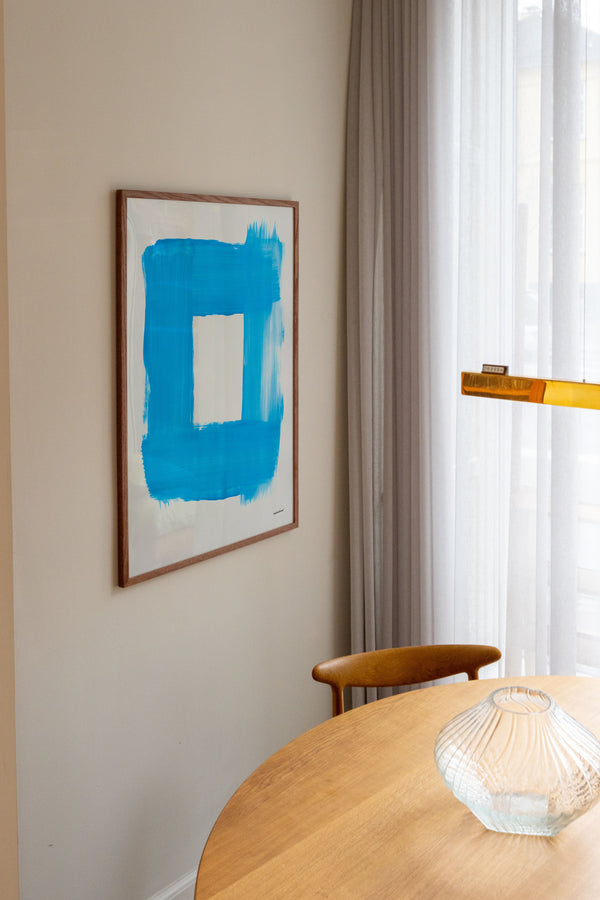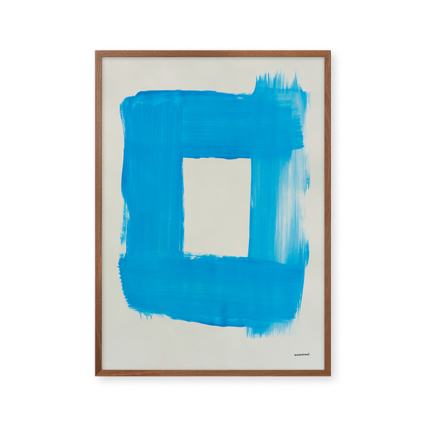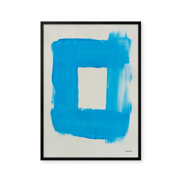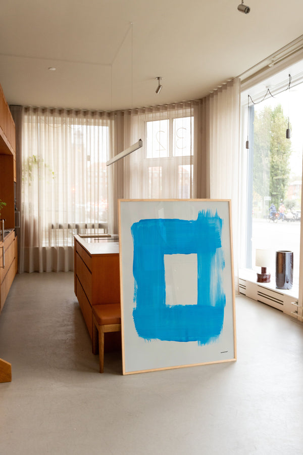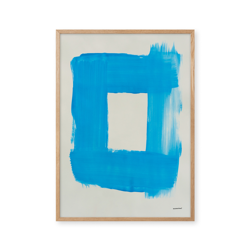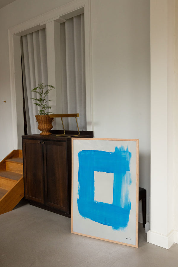 Kunstplakaten "Cadre" af Sara Stribrant er malet som en del af en større kollektion, hvor de blå nuancer indtager en central rolle. For Sara har det været afgørende, at værket står åbent for fortolkning.
