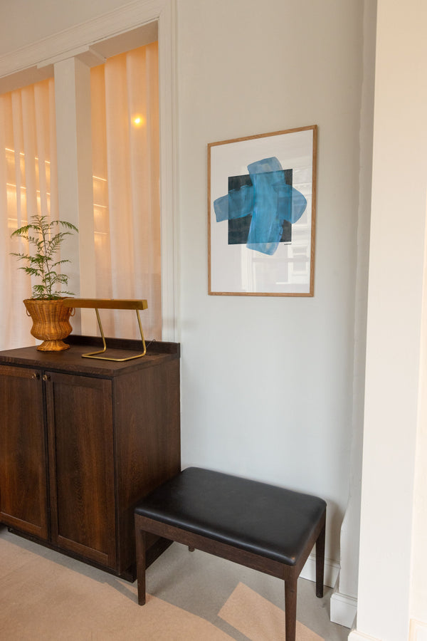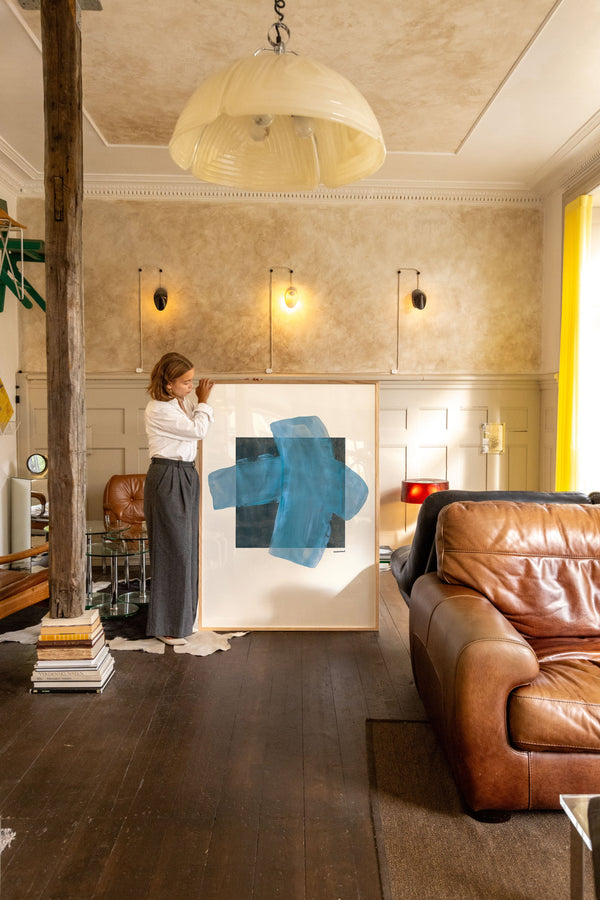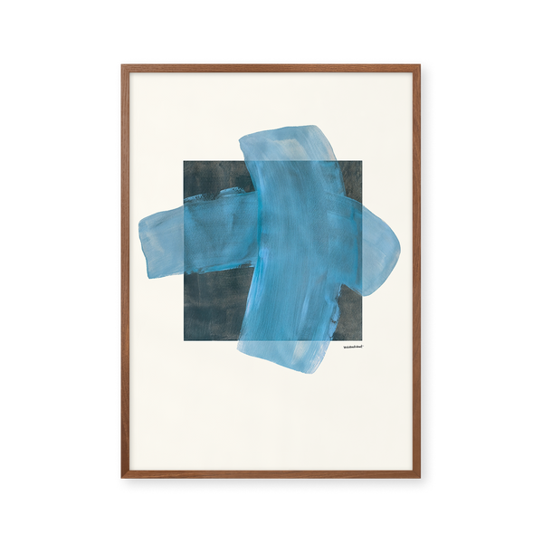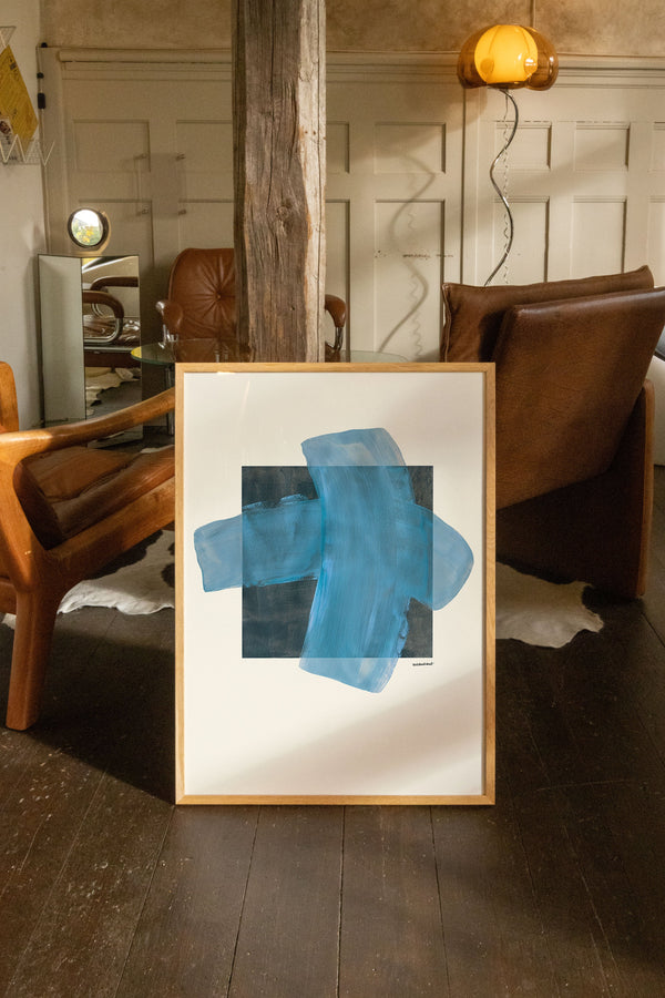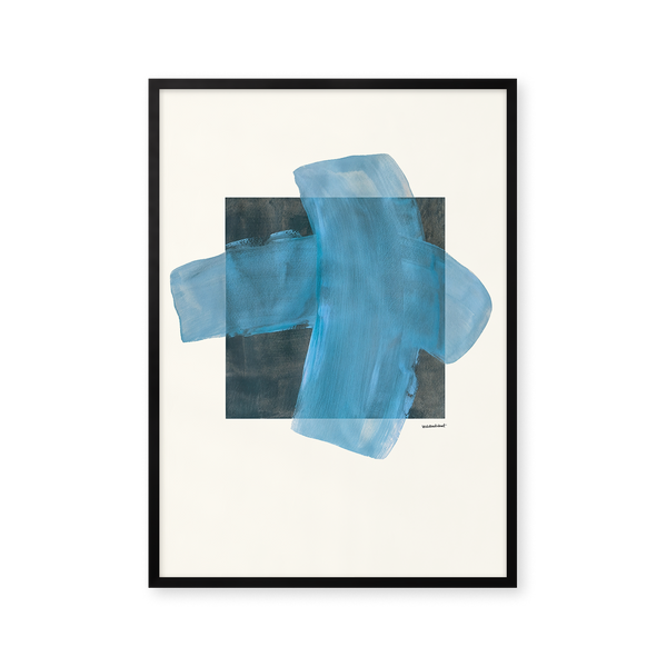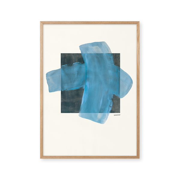 Kunstplakaten "Grid" af Sara Stribrant er malet som en del af en større kollektion, hvor de blå nuancer indtager en central rolle. For Sara har det været afgørende, at værket står åbent for fortolkning.