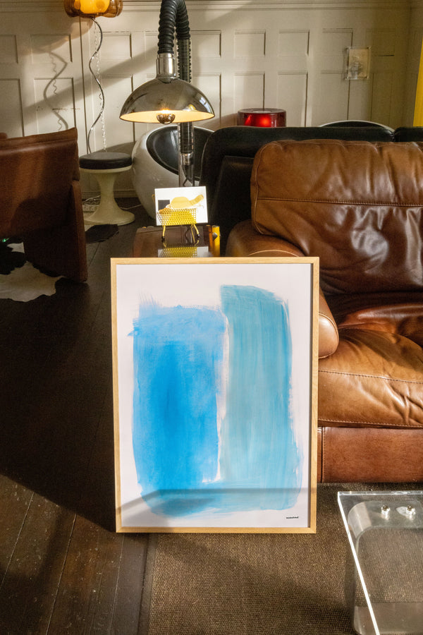 Kunstplakaten " Piscine" af Sara Stribrant er malet som en del af en større kollektion, hvor de blå nuancer indtager en central rolle. For Sara har det været afgørende, at værket står åbent for fortolkning.