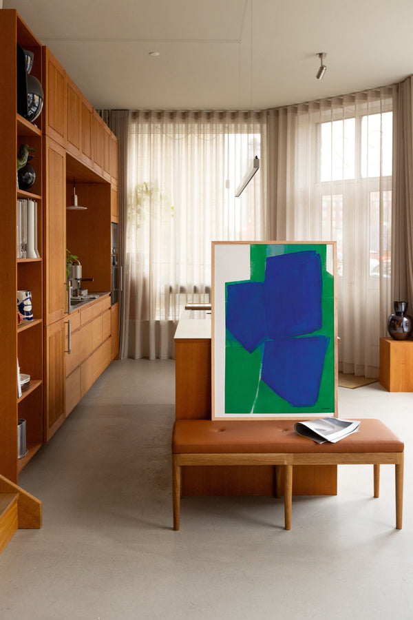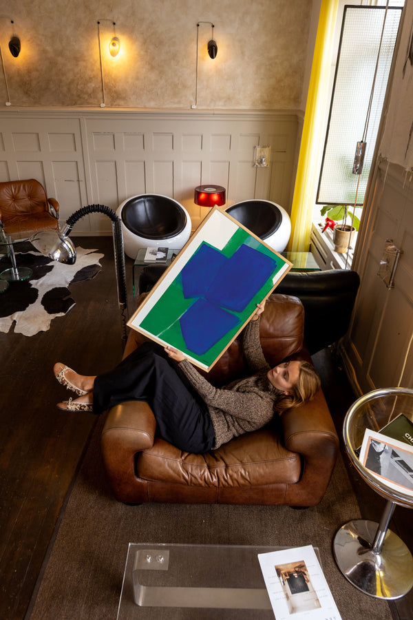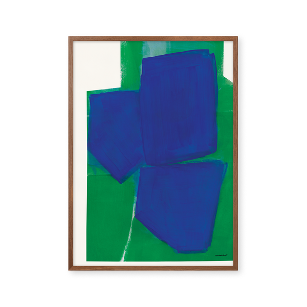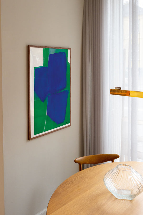 Kunstplakaten "Pomme" af Sara Stribrant er malet som en del af en større kollektion, hvor de blå nuancer indtager en central rolle. For Sara har det været afgørende, at værket står åbent for fortolkning.