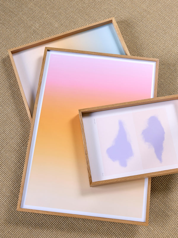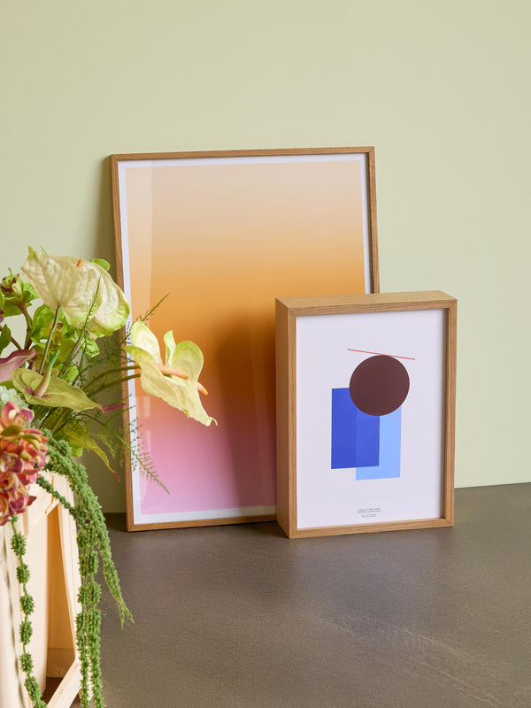 Our frames are made from high-quality materials and are available in solid oak, dark-stained oak, and black-painted pine. All frames come with real glass, while the largest sizes (70 × 100 cm and 100 × 140 cm) feature 2 mm acrylic glass, which looks like glass but is lighter and more shatter-resistant (durable).