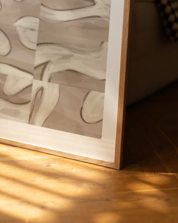 Our frames are made from high-quality materials and are available in solid oak, dark-stained oak, and black-painted pine. All frames come with real glass, while the largest sizes (70 × 100 cm and 100 × 140 cm) feature 2 mm acrylic glass, which looks like glass but is lighter and more shatter-resistant (durable).