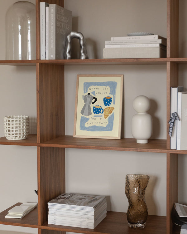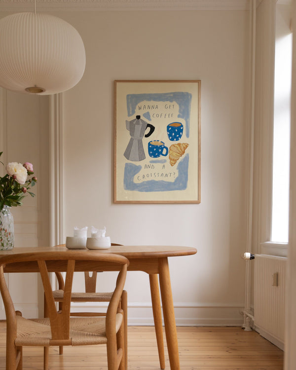 The art poster: “Coffee and Croissant” by the artist Lauren Emmett is an illustrated poster curated by Peléton. It has been meaningful to her that the poster is open to interpretation.