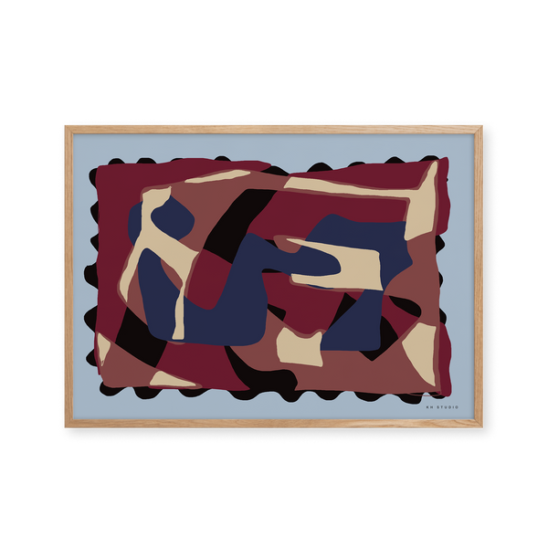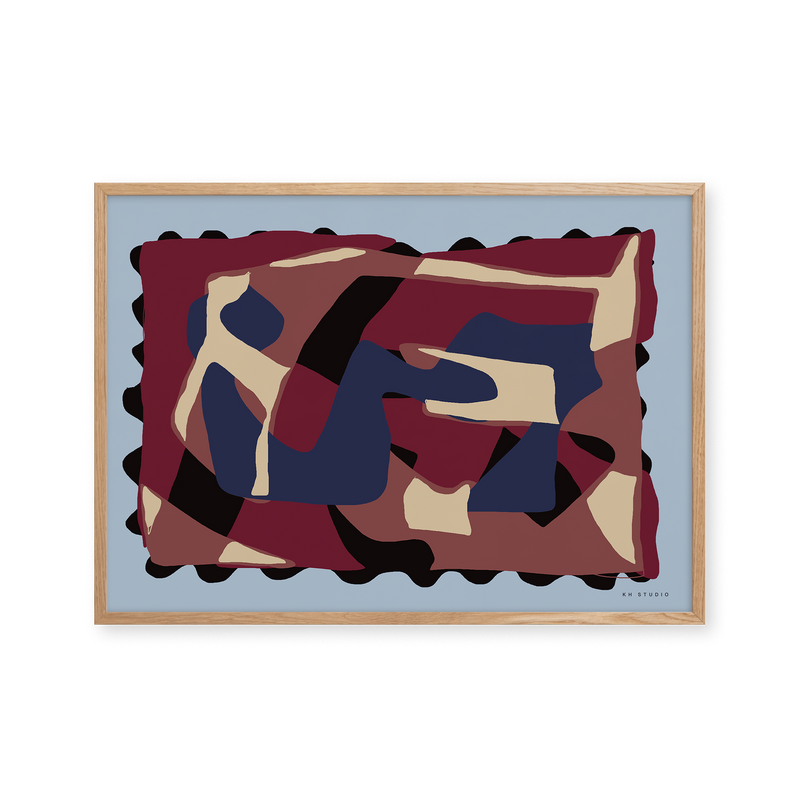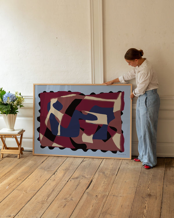 Karla Hymans kunstplakat "Denim & Wine" er en del af en farverig kollektion udviklet specielt til Peléton, og som hylder legende kompositioner og stærke farvevalg. Hendes værker er præget af en enkel og abstrakt stil, hvor form og farver spiller tæt sammen.