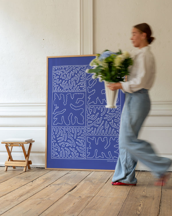The art print: “Milla Blue” by the artists Mathilda Boalawong is a graphically illustrated poster exclusively made for Peléton. It has been meaningful to them that the poster is open to interpretation. This work is part of a collection of exclusive art prints that express minimalism and simplicity.