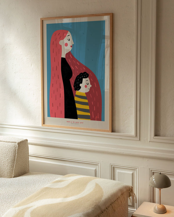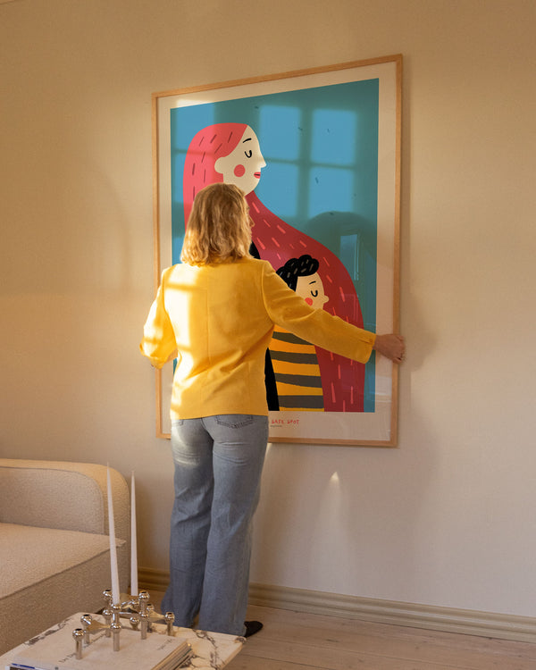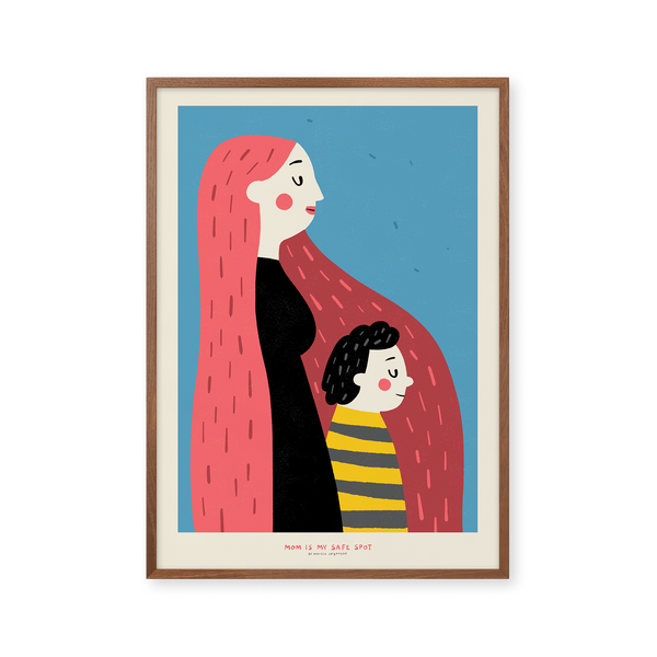 The art poster: "Mom is my safe spot" by the artist Martin Jørgensen is an illustrated poster curated by Peléton. It has been meaningful for Martin Jørgensen says the poster is open to interpretation.