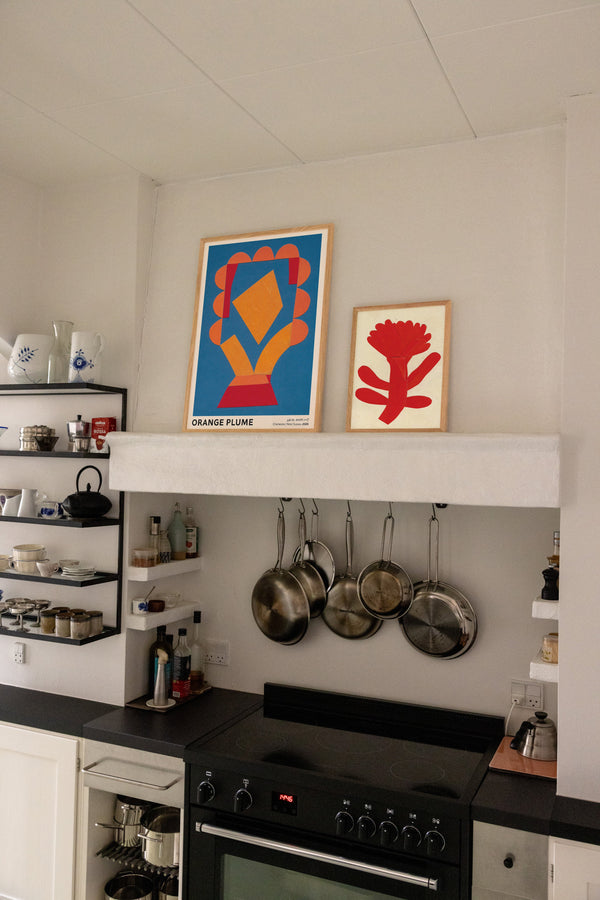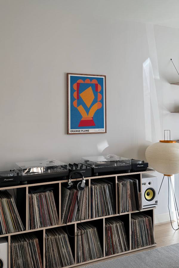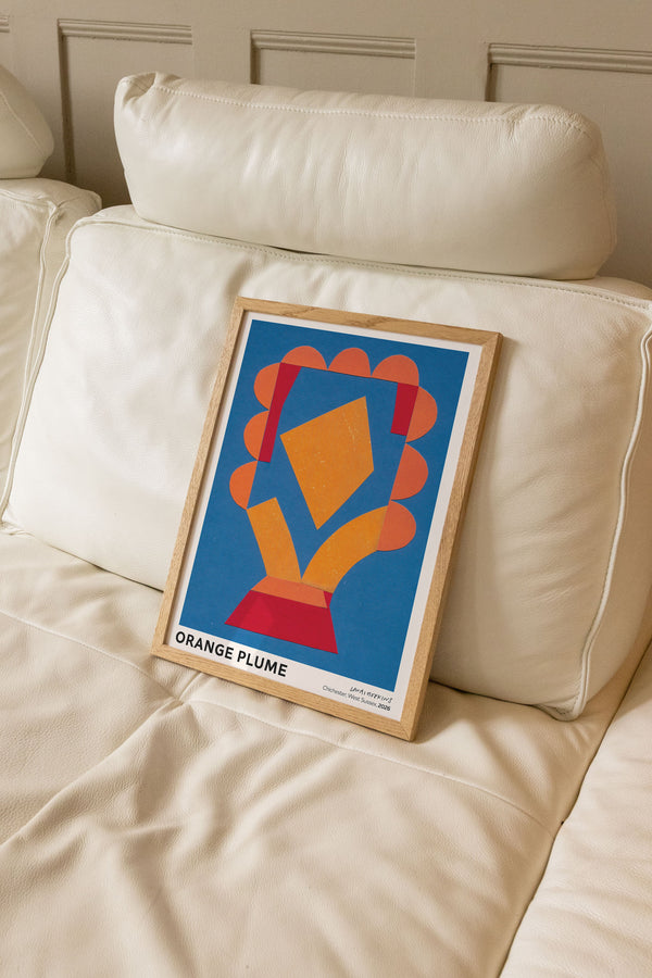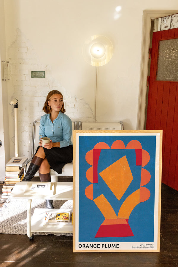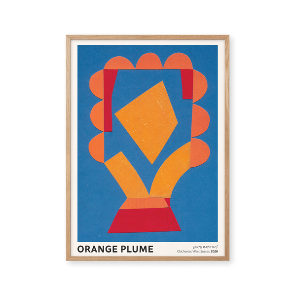 Kunstplakaten: "Orange Plume” af kunstneren Lauri Hopkins forener papirklip og collage i en sanselig og harmonisk komposition. Værket er eksklusivt skabt til Peléton og står åbent for fri fortolkning.