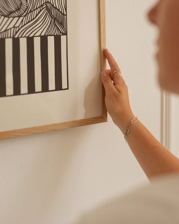 Our frames are made from high-quality materials and are available in solid oak, dark-stained oak, and black-painted pine. All frames come with real glass, while the largest sizes (70 × 100 cm and 100 × 140 cm) feature 2 mm acrylic glass, which looks like glass but is lighter and more shatter-resistant (durable).