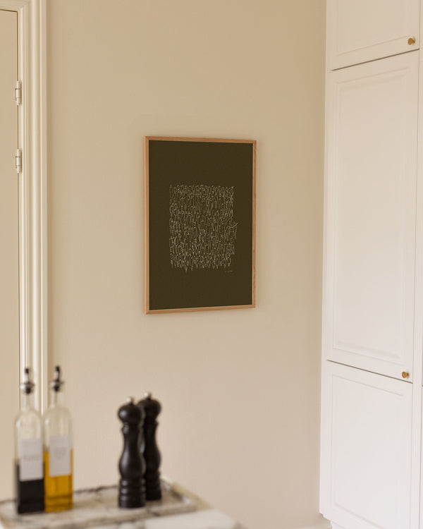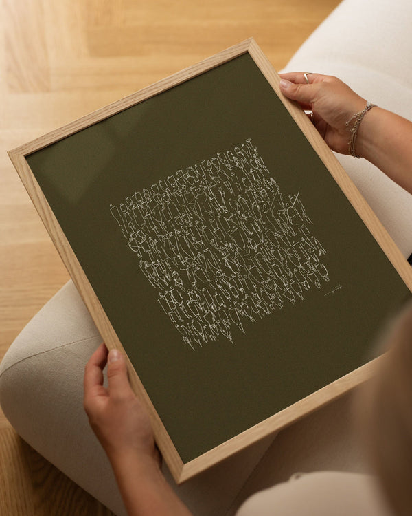 Our frames are made from high-quality materials and are available in solid oak, dark-stained oak, and black-painted pine. All frames come with real glass, while the largest sizes (70 × 100 cm and 100 × 140 cm) feature 2 mm acrylic glass, which looks like glass but is lighter and more shatter-resistant (durable).