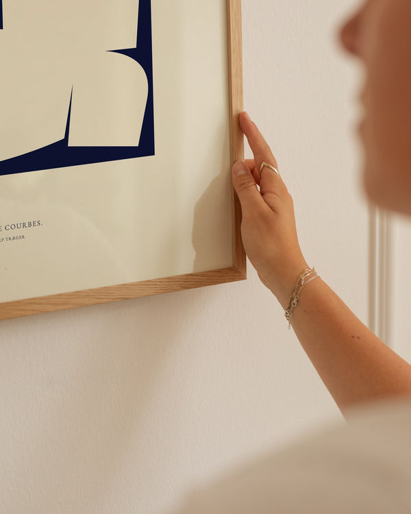 Our frames are made from high-quality materials and are available in solid oak, dark-stained oak, and black-painted pine. All frames come with real glass, while the largest sizes (70 × 100 cm and 100 × 140 cm) feature 2 mm acrylic glass, which looks like glass but is lighter and more shatter-resistant (durable).