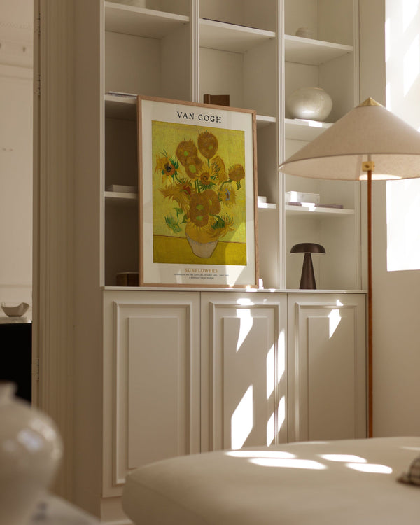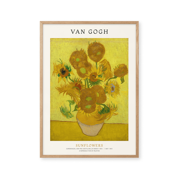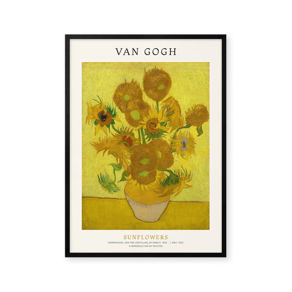The art print: "Sunflowers" by the artist Vincent van Gogh is a painted poster recreated by Peléton. This poster series with Vincent van Gogh's art prints is characterized by his artworks with strong colors and dramatic, impulsive, and expressive brushwork. This poster is part of Peleton's vintage collection with museum layout. The art print is produced on quality paper with long durability, high opacity, and detailed color reproduction.