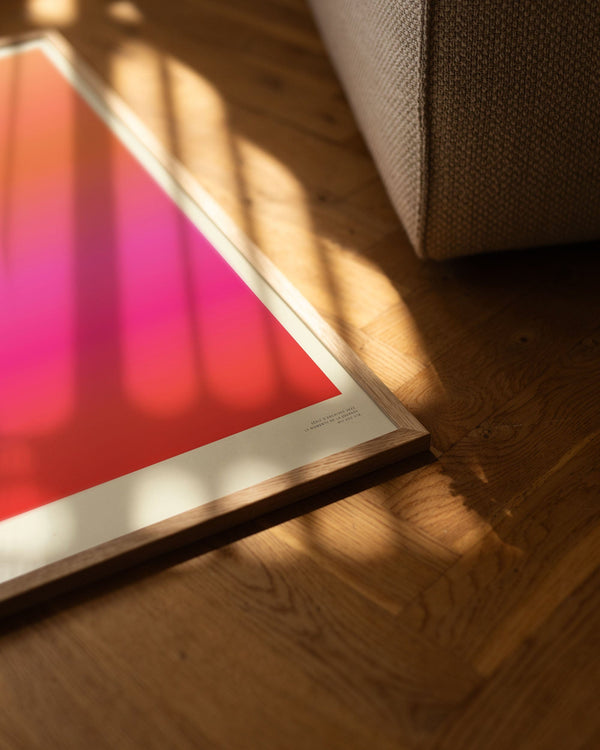 Our frames are made from high-quality materials and are available in solid oak, dark-stained oak, and black-painted pine. All frames come with real glass, while the largest sizes (70 × 100 cm and 100 × 140 cm) feature 2 mm acrylic glass, which looks like glass but is lighter and more shatter-resistant (durable).