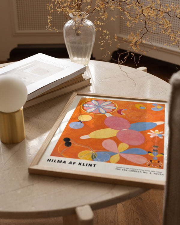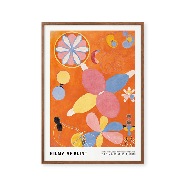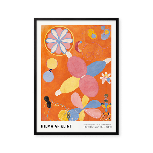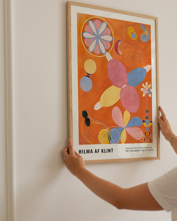 The art print: “The Ten Largest, No. 4, Youth” by the artist Hilma af Klint is an abstract illustrated art print, recreated by Peléton. This art print series with Hilma af Klint's unique and abstract art prints is characterized by her inventive and personal expression. This art print is part of Peléton's vintage collection with museum layout. The art print is produced on quality paper, with long durability, high opacity, and detailed color reproduction.